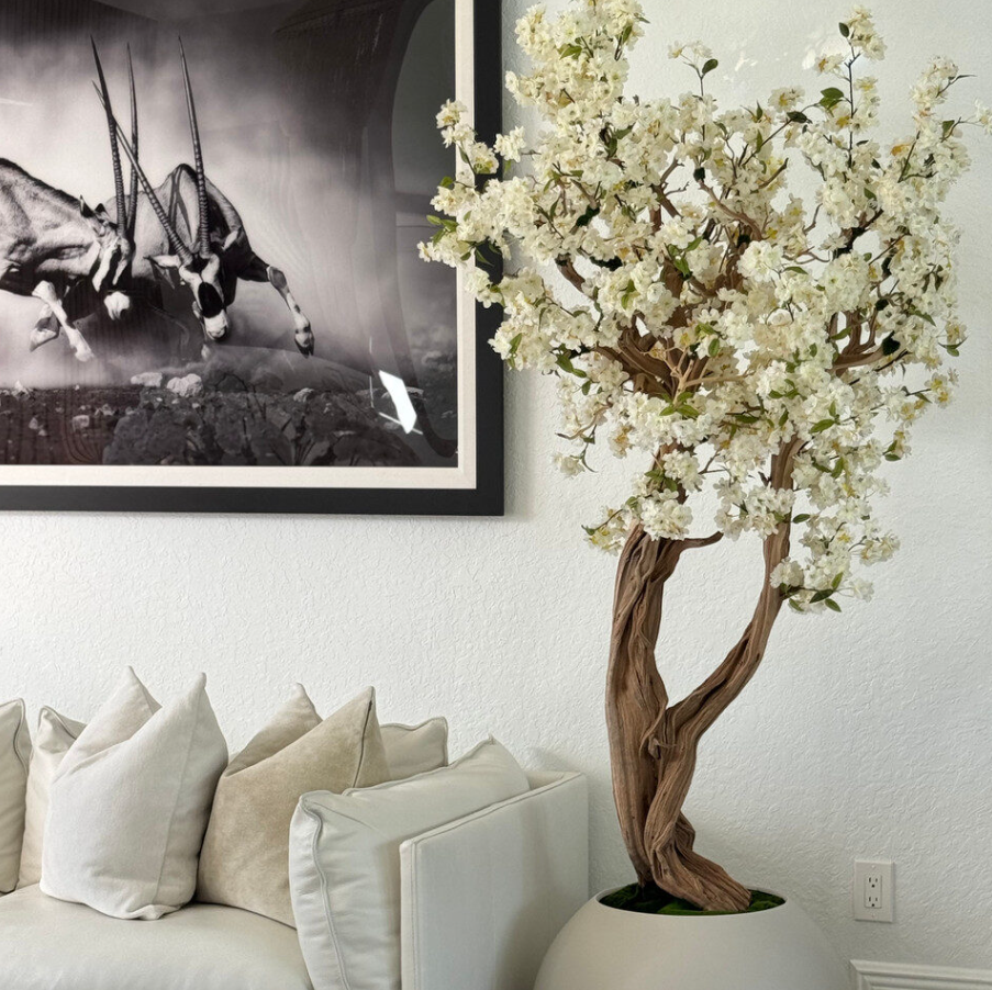 O tamanho e a forma do vaso criam a base ideal para a árvore de cerejeira branca de grande porte. Cada árvore é exclusiva, com flores aplicadas manualmente por artesãos especializados sobre troncos de madeira natural das montanhas da Califórnia. O resultado é um arranjo elegante e marcante, que adiciona frescor e sofisticação a qualquer ambiente.