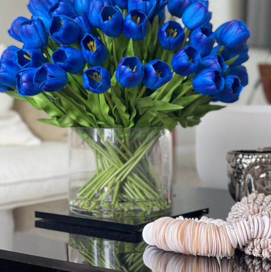 Este arranjo traz um buquê abundante de tulipas azuis simplesmente deslumbrante. Produzidas artesanalmente e com aparência extremamente realista, as flores combinadas com folhas bem definidas parecem ter sido colhidas diretamente de um jardim de primavera. O visual clean e sofisticado é complementado por um vaso cilíndrico de vidro com água acrílica, que reforça ainda mais o efeito natural.