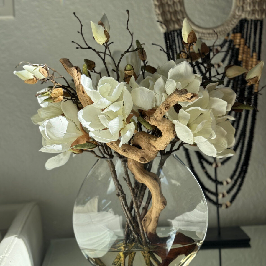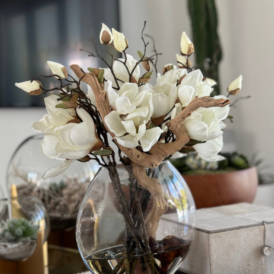 Vaso Moon 25 cm com múltiplas hastes de flores de magnólia, folhagens e madeira ghost wood jateada, fixadas em nossa água de efeito realista (illusion water). Disponível nas cores pêssego ou branco, este arranjo apresenta galhos de magnólia incrivelmente realistas que não desbotam com o tempo. Cada flor e folha é colocada manual e cuidadosamente, capturando cores vivas e detalhes excepcionais, uma verdadeira homenagem à arte da natureza.